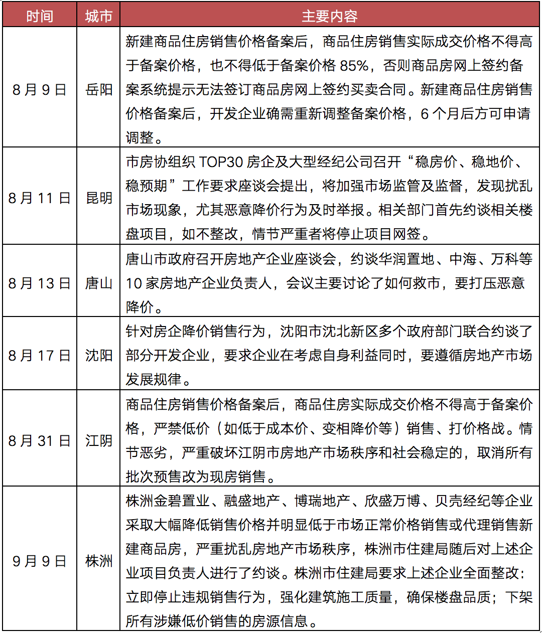 出于穩(wěn)房?jī)r(jià)、穩(wěn)預(yù)期的需要,岳陽(yáng)、昆明等6城相繼落地“限跌令”。其中,岳陽(yáng)、江陰明文規(guī)定禁止大幅降價(jià),昆明、唐山、沈陽(yáng)、株洲采取約談的方式,禁止房企、中介機(jī)構(gòu)惡意降價(jià)、打價(jià)格戰(zhàn),擾亂房地產(chǎn)市場(chǎng)秩序。