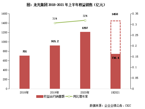 2021年上半年,龍光連續(xù)6個(gè)月業(yè)績均破百億,累計(jì)實(shí)現(xiàn)權(quán)益銷售額736.4億元、權(quán)益銷售面積390.5萬平方米,分別同比增長58.9%、28.3%。按全年1450億元銷售目標(biāo)算,上半年目標(biāo)完成率達(dá)到50.8%。從供貨安排來看,下半年可售貨值有1560億元,新開盤項(xiàng)目有33個(gè),繼續(xù)保持銷售節(jié)奏,大概率會(huì)達(dá)成年度目標(biāo)。
