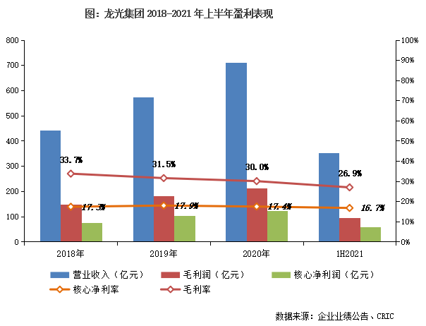 在行業(yè)利潤率普遍下滑背景下,上半年公司毛利率27%,較2020年微降3個(gè)百分點(diǎn),明顯低于行業(yè)平均降幅。盈利能力保持穩(wěn)定,競(jìng)爭(zhēng)優(yōu)勢(shì)持續(xù)穩(wěn)固。未來,龍光保證、提升自身的盈利能力,需進(jìn)一步加強(qiáng)土地成本控制、提高管理效能。