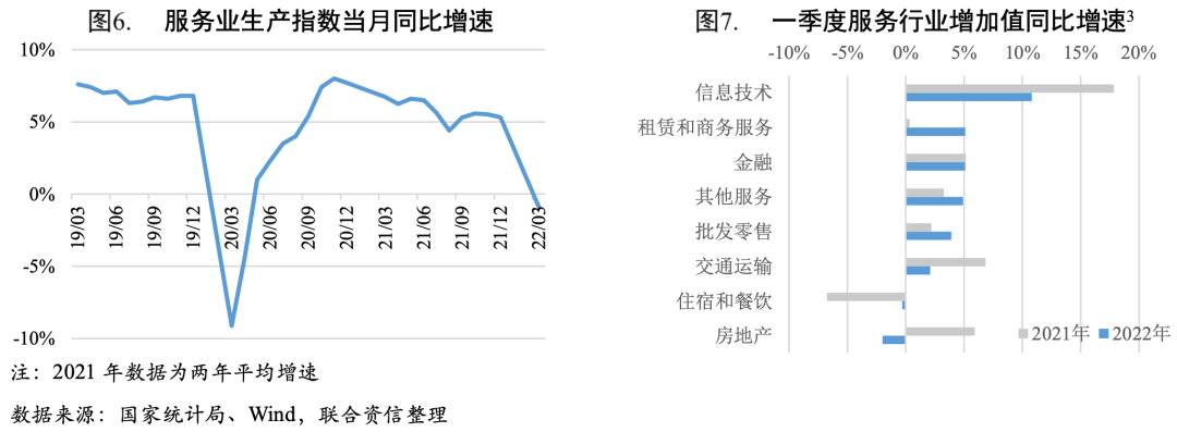 本輪疫情對服務業生產造成較大沖擊。受大規模疫情影響,3月服務業生產指數同比下降0.90%,接觸型服務領域受到較大沖擊。從行業來看,一季度信息傳輸、軟件和信息技術服務業,租賃和商務服務業以及金融業發展較好,增加值同比增長超過5%;而房地產、住宿和餐飲行業增加值同比有所下降,受疫情影響較大。值得關注的是,3月以來受疫情影響,物流運輸不暢,客運低位運行,交通運輸行業受到較大沖擊。從數據來看,3月交通運輸、倉儲和郵政業生產指數同比下降8.10%,影響服務業生產指數下降0.80個百分點;營業性貨運量同比下降1.90%,客運量同比下降43.50%。