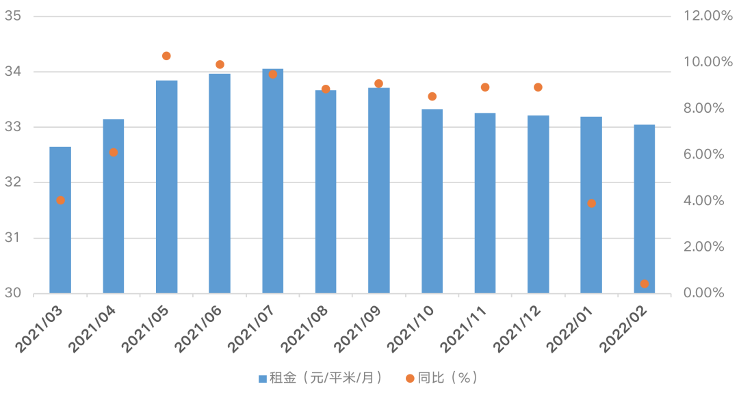當前市場租金價格仍處于高位,2月單月租金仍接近去年全年平均值,有14個城市租金水平高于平均租金。