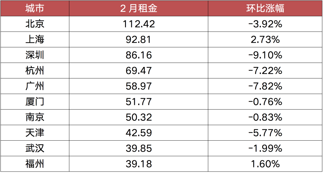 從城市來看,北京2月租金每平方米已突破百元,達到112.42元/平方米/月,成為當月全國唯一一個平均租金過百的城市,且同比漲幅領漲全國。