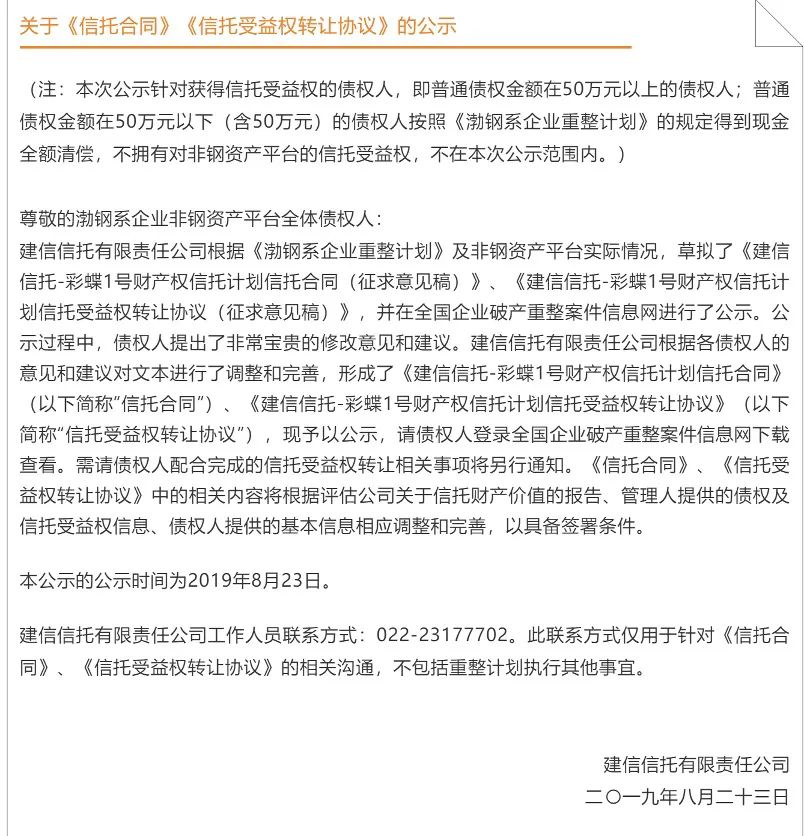 事實上,信托受益人也即債權(quán)人將其對渤海鋼鐵系企業(yè)的債權(quán)作為對價,一旦重整計劃獲得批準(zhǔn),其對渤鋼系企業(yè)所享有的債權(quán)將由信托公司享有,信托公司不向非鋼平臺提供資金支持,而是集中受讓債權(quán)并通過管理和處置信托財產(chǎn)進(jìn)行追索。
