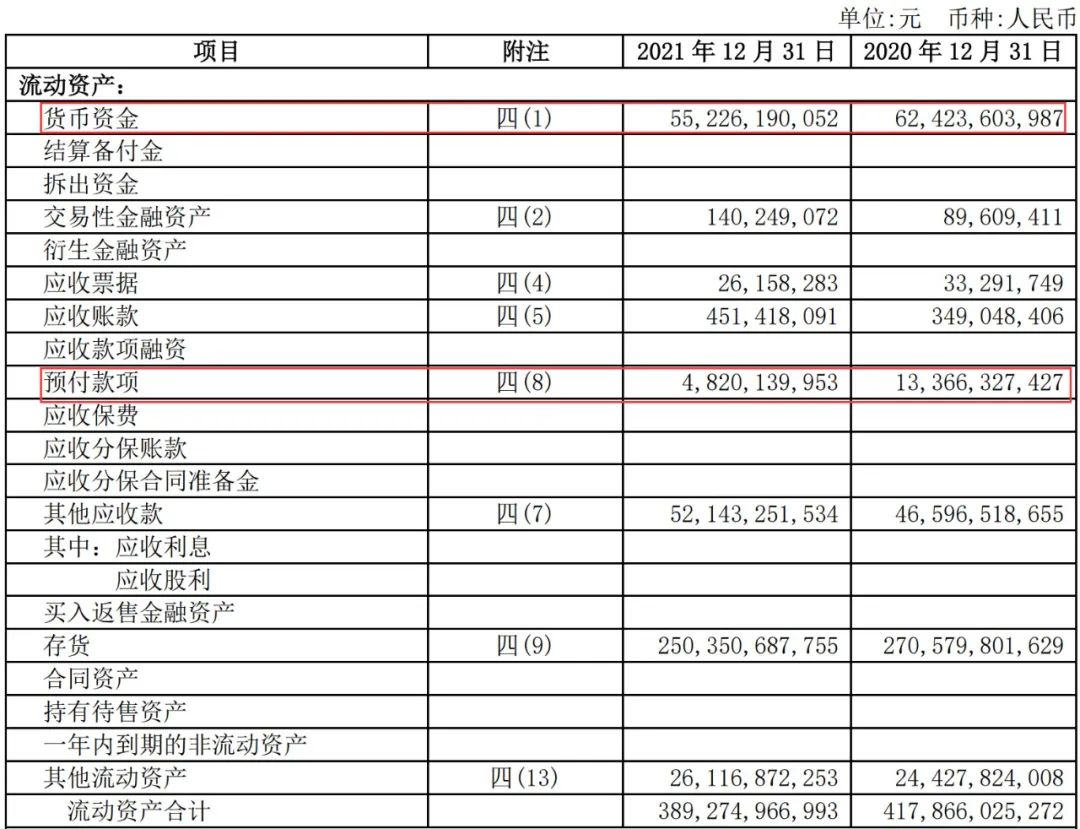 年報顯示,2021年新城控股流動資產中變動較大的是貨幣資金和預付款項。其中貨幣資金同比減少約72億元,為552.3億元。