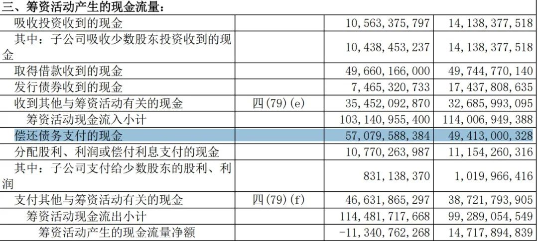 如下圖年報顯示,主要是償還債務支付的現金增加了76.7億到570.8億元;發行債券收到的現金減少了100億左右,為74.65億元;支付其他與籌資活動有關的現金466.3億元,比2020年增加了79億左右,主要包括支付少數股東往來款、償還關聯方計息資金往來、回購庫存股等。