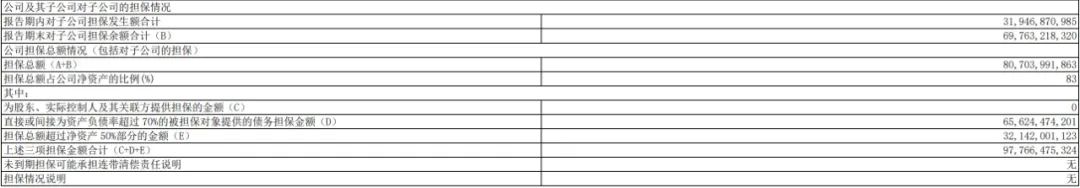 擔保方面,新城控股報告期內對子公司擔保發生額合計為319.5億元,直接或間接為資產負債率超過70%的被擔保對象提供的債務擔保金額為656.2億元,擔保總額超過凈資產50%部分的金額為321.42億元,擔保總額807.03億元,擔保總額占公司凈資產的比例為83%。
