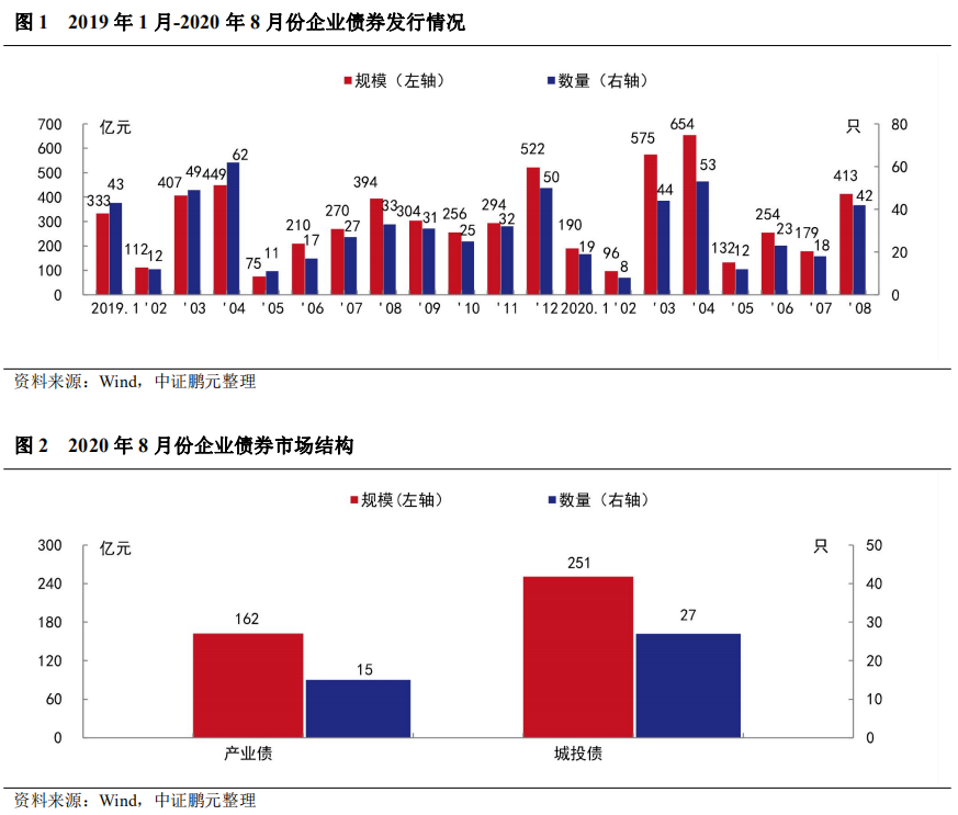 2020年8月,企業債券發行42只,發行規模413.09億元,與上年同期相比分別增長27%和5%;與2020年7月相比,發行數量和發行規模分別增長133%和131%。從市場結構來看,8月發行的企業債有15只為產業債,發行規模162.30億元。整體看,8月,到期規模大幅增長,市場環境相對穩定,當月發行規模順勢增長。
