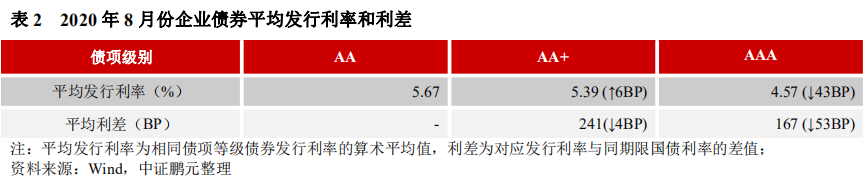 與上月相比,2020年8月,7年期企業債各級別的平均發行利率均下行,其中,AAA級下行25BP, AA級下行9BP;利差方面,AAA級和AA+級分別收窄37BP和20BP。