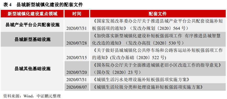 此外,8月18日,發改委發布《關于信貸支持縣城城鎮化補短板強弱項的通知》 (發改規劃〔2020〕1278號)作為城鎮化建設配套文件,明確相關支持條件:第一,符合《發行指引》的建設內容要求。第二,項目收入在運營期內可以覆蓋貸款本息,且資本金不低于國家最低比例,同時或先于貸款到位。第二,借款人為公益二類或經營類事業法人,具有承擔新型城鎮化建設項目投資運營的相關資質和能力。此外,明確“對符合條件的項目,可通過直接投資、資本金注入、投資補助、貸款貼息等方式,優先安排財政性資金或地方政府專項債券,以促進項目的經營性現金流與貸款條件相匹配。各地區通過提高地方政府專項債券作為項目資本金比例等方式,加強與六家銀行信貸投放的配套銜接。”
