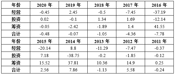 盡管多年大量籌資,信威集團(tuán)現(xiàn)金流在多數(shù)時(shí)間仍為負(fù)值。且從2011年開始,九年時(shí)間未見任何改善,每年都是借新債還舊債來度過危機(jī)。
