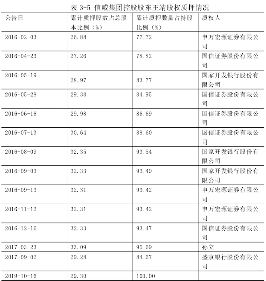 公開資料顯示,2016至2017年間,信威集團(tuán)董事長(zhǎng)兼最大股東王靖陸續(xù)將其個(gè)人持有股份全部質(zhì)押,質(zhì)押機(jī)構(gòu)包括國(guó)家開發(fā)銀行、盛京銀行和各大證券公司。通過上述股權(quán)質(zhì)押操作,王靖累計(jì)獲得現(xiàn)金超百億元。