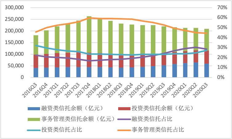 從占比來看,2020年3季度末,房地產信托占比為13.8%,比2019年末和2019年2季度末分別下降1.27和1.58個百分點。