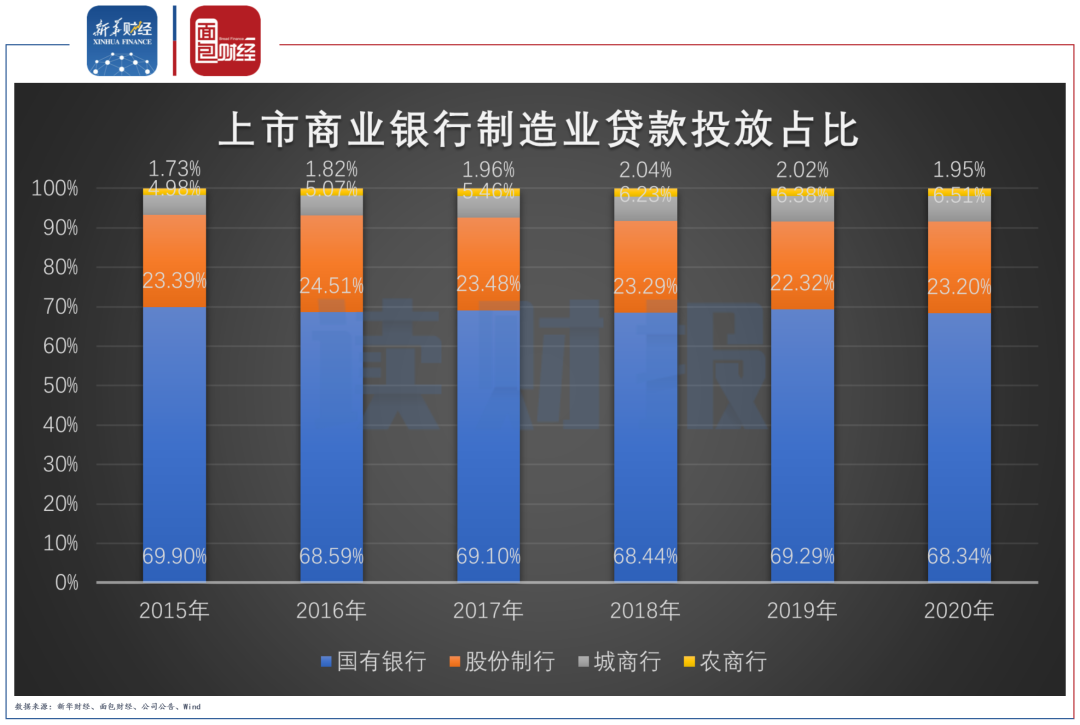 城商行和農商行的制造業貸款投放占比相對較小,截至2020年末,城商行和農商行的制造業貸款占比分別為6.51%和1.95%。