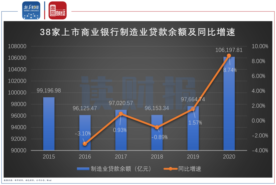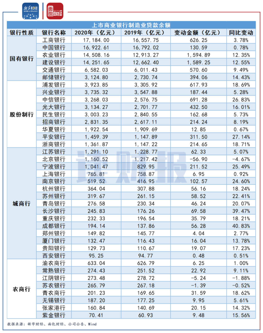 針對A股38家上市商業銀行2020年報制造業貸款情況,新華財經和面包財經研究員從余額、增速、占比以及不良率等角度進行了梳理。