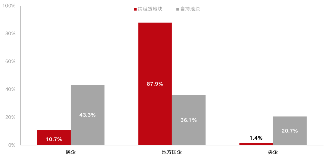 租賃用地主要3種供地方式:純租賃地塊、競自持租賃地塊和集體用地。純租賃地塊因折價較多,一般是地方國企接盤,CRIC系統數據顯示,年內87.9%的純租賃地塊由地方國企斬獲。而競自持租賃地塊約56.7%由國資獲取,民企或主動或被動選擇,仍取得其中的43.3%,多為龍湖、旭輝、中駿等涉及住房租賃的主流房企。