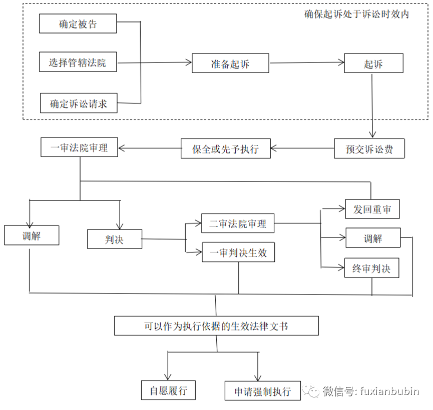 即通過民事訴訟、民商事仲裁、民事督促(支付令)、執行公證債權文書、直接向法院申請實現擔保物權的方式,確立債權的合法性,依靠強制程序收回債權的清收處置方式。其中,訴訟流程較為復雜,主要如下圖所示:
