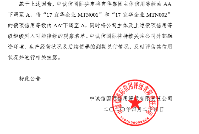 4月24日,中誠信國際決定將宜華集團主體信用等級由AA下調至A,將“17宜華企業MTN001”和“17宜華企業MTN002”的債項信用等級由AA-下調至A,同時將公司主體及上述債項信用等級繼續列入可能降級的觀察名單。