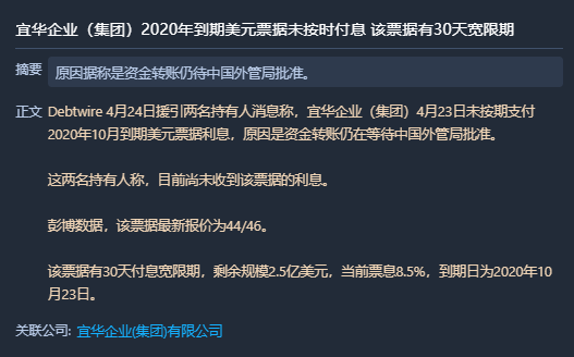 就在此次降級之前,美元債的付息逾期事件,或許驗證了宜華企業資金緊張的事實。4月24日,來自BondInsight的消息顯示4月23日宜華企業(集團)未按時支付2020年10月到期美元票據利息有關,該票據有30天付息寬限期。