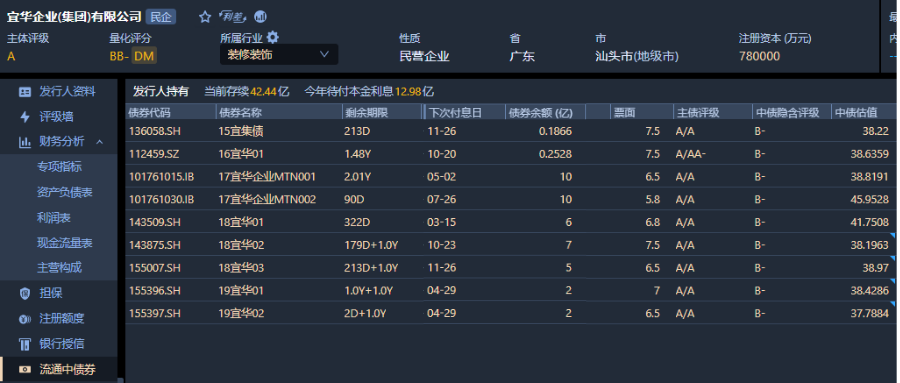 宜華企業(集團)當前流通中債券存續余額為42.44億元,今年待付本金利息合計12.98億元。