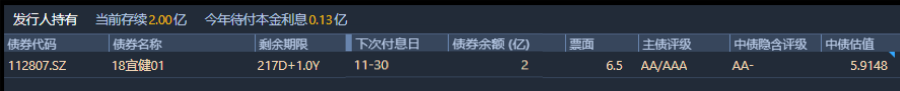 宜華健康當前流通中債券存續存續2.00億元,今年待付本金利息0.13億元。