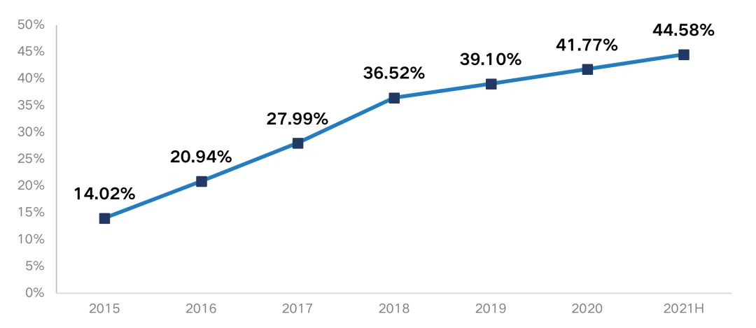 從項目表外化率來看,樣本房企表外化率呈持續攀升趨勢,從2018年36.52%持續增加至2021年中期的44.58%,部分房企將表內杠桿“降檔”壓力通過出表高杠桿的項目公司將其轉移至表外,達到隱藏表外負債、美化報表的目的。