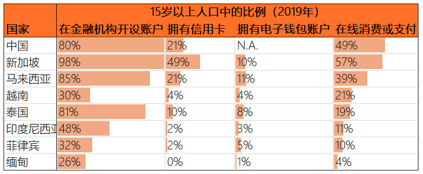 東南亞地區(qū)正規(guī)金融服務(wù)不足,基礎(chǔ)設(shè)施落后,產(chǎn)生了大量無銀行賬戶和銀行賬戶不足的人群。根據(jù)《e-Conomy SEA 2020》數(shù)據(jù),東南亞近4億成年人中,只有1.04億成年人完全擁有銀行賬戶、信用卡、投資和保險服務(wù),充分享受金融服務(wù)。由于東南亞公共登記、身份識別系統(tǒng)及可信賴的信用信息缺失無法獲得信用卡等其他金融服務(wù),僅0.98億成年人擁有銀行賬戶。剩余1.98億成年人完全沒有任何賬戶服務(wù),主要原因是東南亞基礎(chǔ)建設(shè)能力較弱,金融機(jī)構(gòu)需要對所屬服務(wù)類目投入巨大開支,才能滿足所有客戶需求。