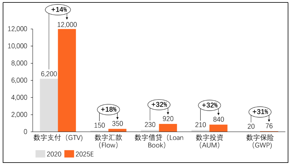 其中數(shù)字支付服務(wù)發(fā)展規(guī)模最大,目前數(shù)字支付總交易額(GTV)已達(dá)6200億美元,預(yù)計2025年總交易額(GTV)將達(dá)到12000億美元,主要來源于電商、打車等線上交易服務(wù)帶來的支付驅(qū)動。此外盡管其他金融服務(wù)仍然處于初級數(shù)字化階段,但是據(jù)預(yù)測2020至2025年未來五年內(nèi),數(shù)字匯款、借貸、投資和保險的滲透率將會有兩到三倍的增長,依次達(dá)到28%、8%、11%、9%。預(yù)計2020年-2025年均復(fù)合增長率將依次達(dá)到18%、32%、32%、31%。