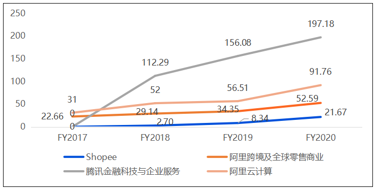 注:1.Shopee為騰訊投資東南亞電商公司;2.阿里跨境零售營收包括自營東南亞電商Lazada、速賣通、土耳其電商Trendyol;3.騰訊云計算業(yè)務(wù)營收目前屬于金融科技與企業(yè)服務(wù)類目