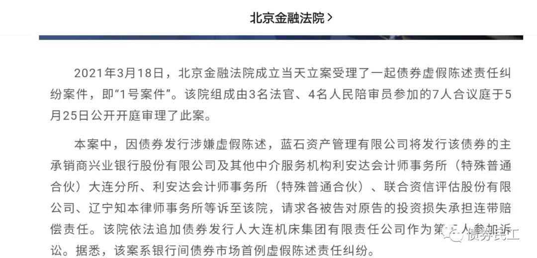 北京金融法院成立于2021年3月18日,成立當(dāng)天即受理了大連機(jī)床債券虛假陳述責(zé)任糾紛案件,是北京金融法院的“1號(hào)案”。根據(jù)北京金融法院公開披露的信息,2021年5月25日法院正式開庭審理“1 號(hào)案”,大連機(jī)床債券虛假陳述責(zé)任糾紛案件系銀行間債券市場(chǎng)首例虛假陳述責(zé)任糾紛。