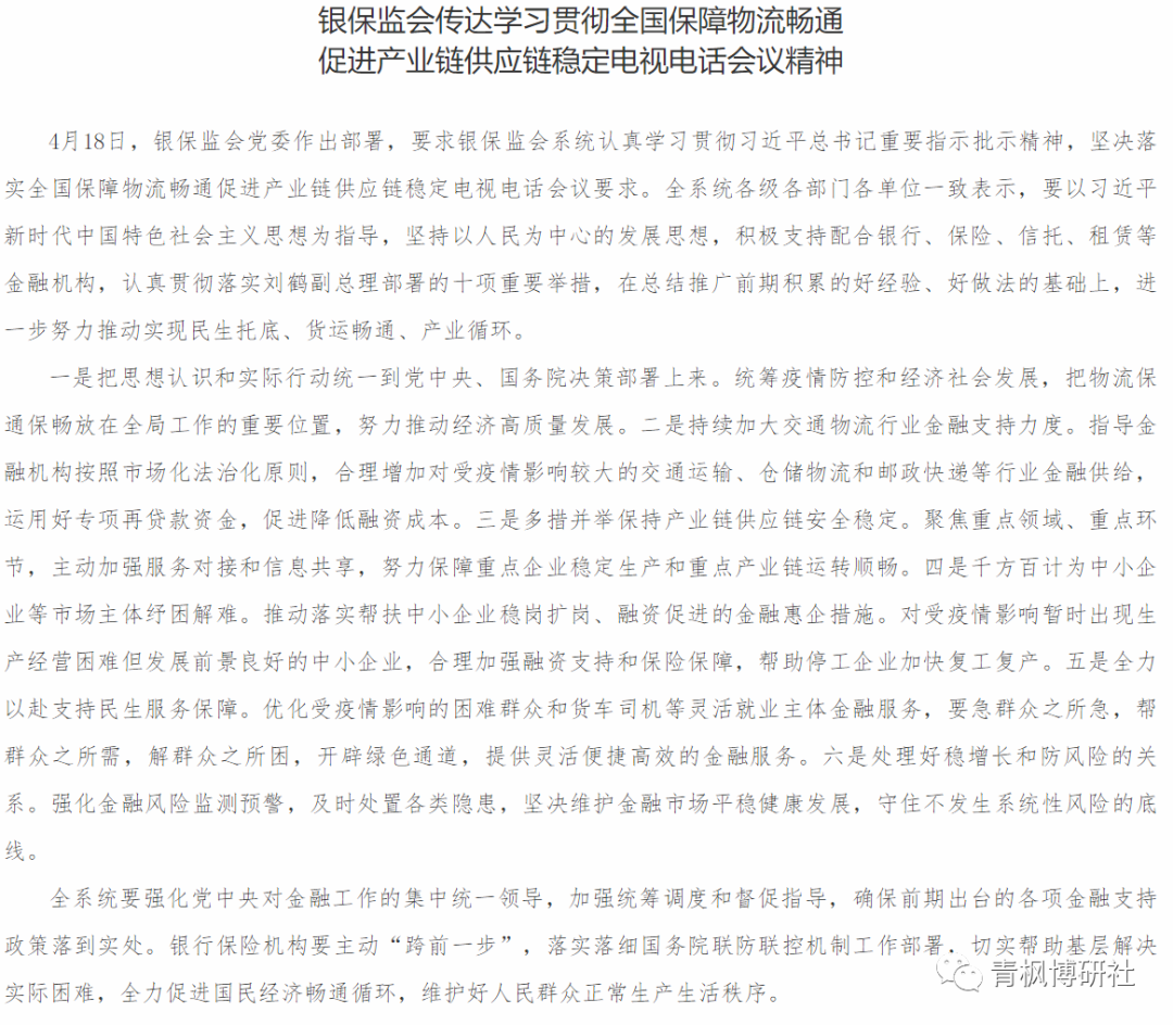 一、央行與銀保監會傳達會議精神:落實保障物流暢通和產業鏈供應鏈穩定工作