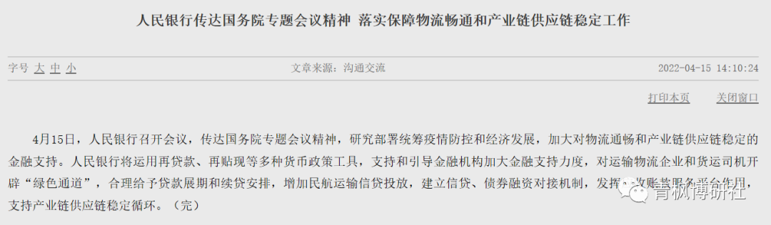 (一)2022年4月15日,央行召開會議,傳達國務院專題會議精神,進一步落實保障物流暢通和產業鏈供應鏈穩定工作,明確將運用再貸款、再貼現等多種貨幣政策工具,通過合理給予貸款展期和續貸安排,建立信貸和債券融資對接機制,支持和引導金融機構加大對運輸物流企業和貨運司機的金融支持力度,增加民航運輸信貸投放。可以看出,此次會議的針對性較強,重在運輸物流行業。