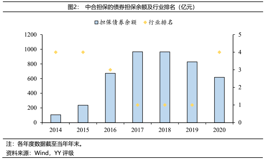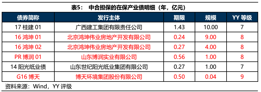 中合擔(dān)保在保產(chǎn)業(yè)債整體資質(zhì)較差,公司今年有一定的代償壓力。截至2021年4月,中合擔(dān)保在保的產(chǎn)業(yè)債余額共25.04億元,其中15.04億將在今年到期。從主體資質(zhì)上看,博天環(huán)境YY等級(jí)為9,鴻坤偉業(yè)、博潤(rùn)實(shí)業(yè)YY等級(jí)為8,陽(yáng)光紙業(yè)YY等級(jí)為7,違約風(fēng)險(xiǎn)較高,且這幾只產(chǎn)業(yè)債均在今年到期,預(yù)計(jì)屆時(shí)公司會(huì)有一定的代償壓力。