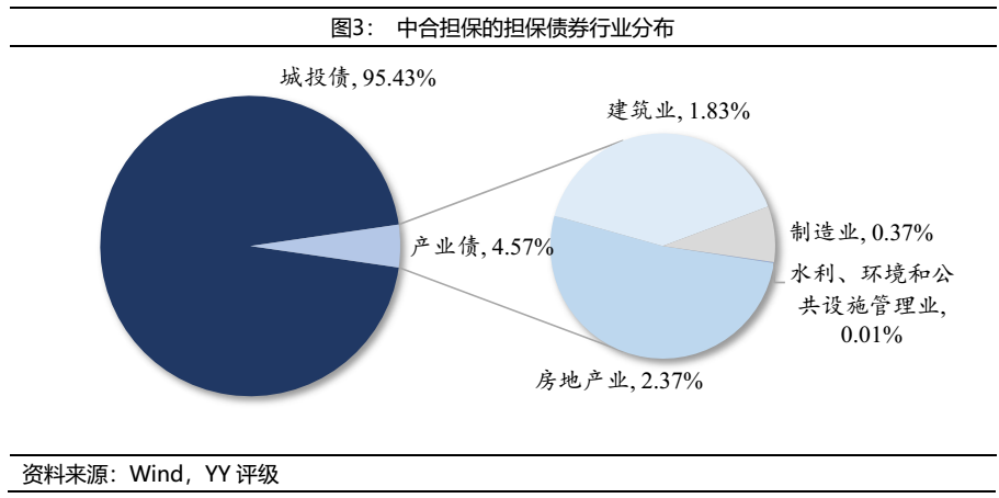 城投債是中合擔(dān)保的在保債券中的絕對(duì)主力,產(chǎn)業(yè)債占比相對(duì)較小。截至2021年4月,中合擔(dān)保的在保債券中城投債余額為522.88億,占比95.43%,產(chǎn)業(yè)債余額為25.04億,占比4.57%。