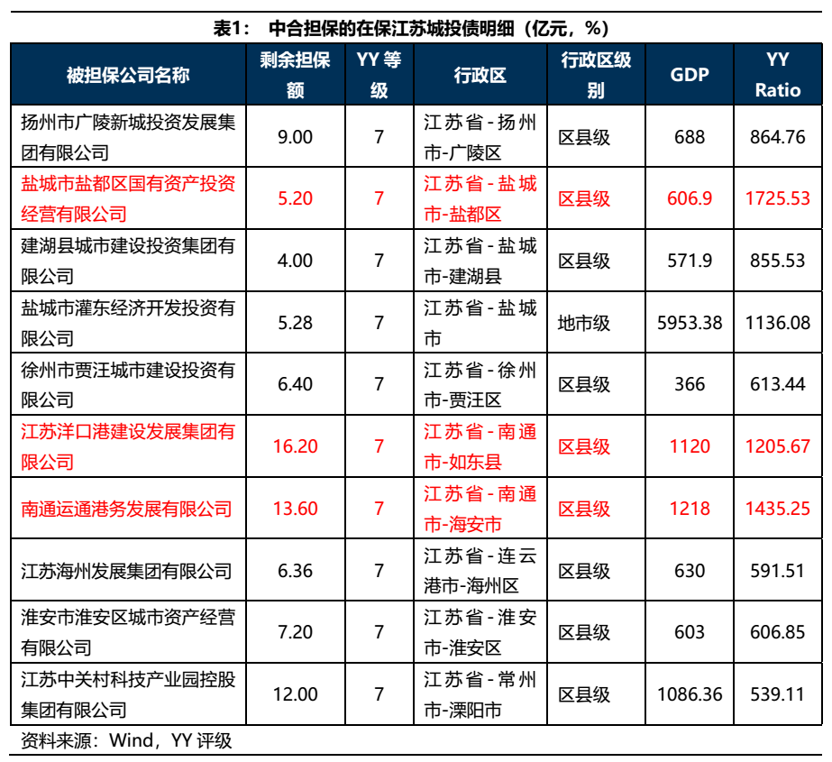 中合在保的江蘇弱資質(zhì)城投債總計(jì)85億元,YY等級(jí)均為7,行政區(qū)級(jí)別以區(qū)縣級(jí)為主。江蘇的平臺(tái)債務(wù)壓力一直較大,但好在其經(jīng)濟(jì)發(fā)展水平較高,所以市場(chǎng)并不十分擔(dān)心其違約,但是鹽都國(guó)資、洋口港建發(fā)、運(yùn)通港務(wù)等層級(jí)較低且所在區(qū)域債務(wù)壓力較大的平臺(tái)仍需重點(diǎn)關(guān)注。