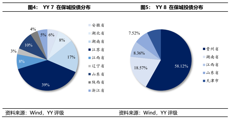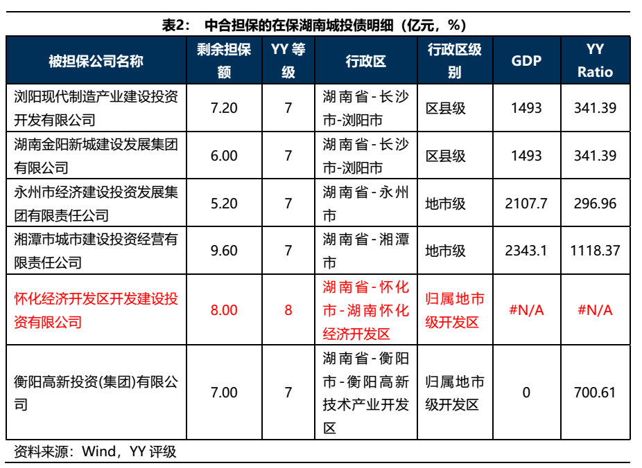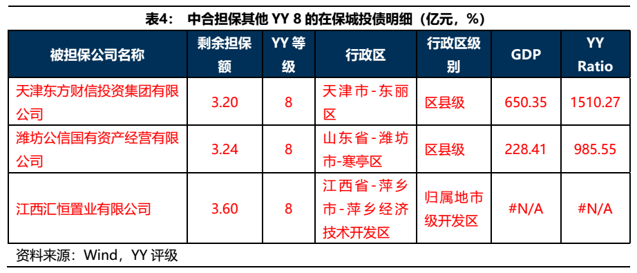 除上述提及的弱資質(zhì)城投債外,中合在保的其他YY等級(jí)達(dá)到8的主體還有三個(gè),分別是江西的匯恒置業(yè),濰坊的公信國(guó)資和天津的東方財(cái)信,剩余擔(dān)保額總計(jì)8億元。天津和濰坊都是城投的網(wǎng)紅地區(qū),債務(wù)壓力較大,涉及到的兩個(gè)主體層級(jí)也較低,需要重點(diǎn)關(guān)注;匯恒置業(yè)平臺(tái)層級(jí)也是較低,且僅是當(dāng)?shù)氐拇我脚_(tái),區(qū)域重要性不高,也需要持續(xù)關(guān)注。
