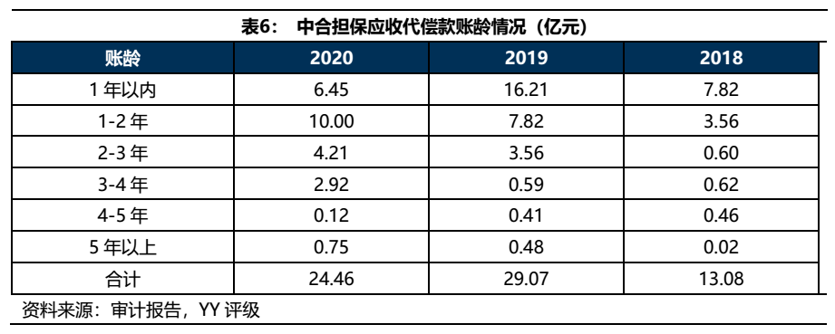 中合擔(dān)保2020的代償情況和回收情況均較2019年有所緩解。從應(yīng)收代償款賬齡來(lái)看,假設(shè)當(dāng)年代償款當(dāng)年未回收,則中合擔(dān)保在2020年共發(fā)生代償6.45億元,相較于2019年的16.21億下降明顯。從代償款回收情況看,2020年回收了2019年的代償款6.21億元,回收了2018年的代償款3.61億元,而2019年對(duì)2018年和2017年的代償款回收均為0,因此代償款回收情況也改善明顯。盡管2020年公司代償情況和回收情況有所緩解,但由于歷史包袱過(guò)重,2020年公司的應(yīng)收代償款減值損失仍然達(dá)到5.92億,導(dǎo)致公司盈利表現(xiàn)較差。