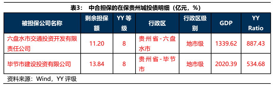 中合在保的貴州弱資質(zhì)城投債總計(jì)25億元,集中在六盤(pán)水和畢節(jié)兩地,YY等級(jí)均為8。作為城投圈里紅得不能再紅的省份,貴州的擔(dān)保債自然是重點(diǎn)關(guān)注的對(duì)象。事實(shí)上,中合在貴州擔(dān)保的城投債總共就只有這25億,但不出意外資質(zhì)都令人擔(dān)憂(yōu)。考慮到貴州這兩個(gè)主體擔(dān)保規(guī)模較大,一旦城投債違約的閘門(mén)被放開(kāi),中合屆時(shí)或面臨較大的代償壓力。