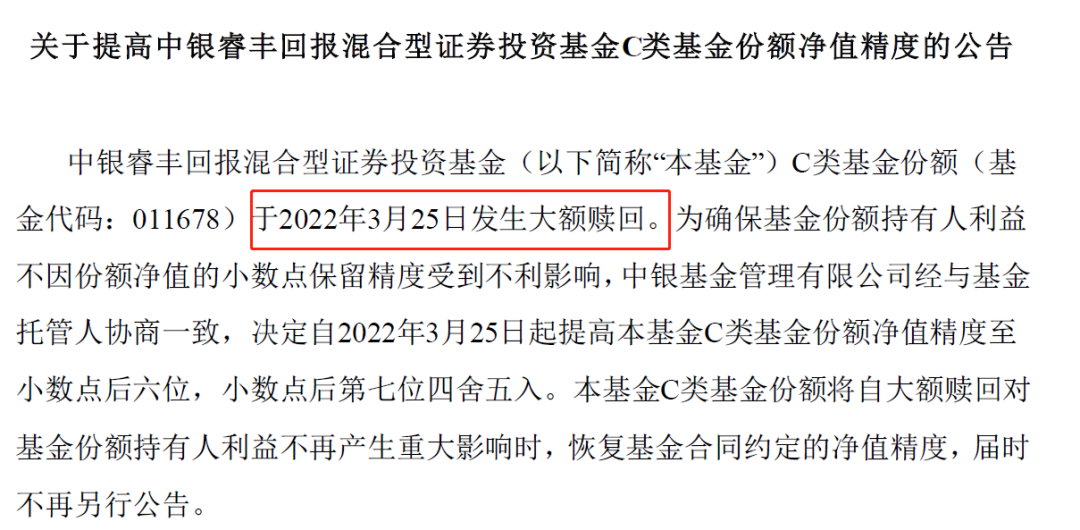 這一背景下,中銀基金旗下“固收+”產(chǎn)品中銀睿豐回報(bào)混合型證券投資基金3月26日公告稱該基金C類份額于3月25日發(fā)生大額贖回。為確?;鸱蓊~持有人利益不因份額凈值的小數(shù)點(diǎn)保留精度受到不利影響,決定自3月25日起提高C類基金份額凈值精度至小數(shù)點(diǎn)后六位,小數(shù)點(diǎn)后第七位四舍五入。