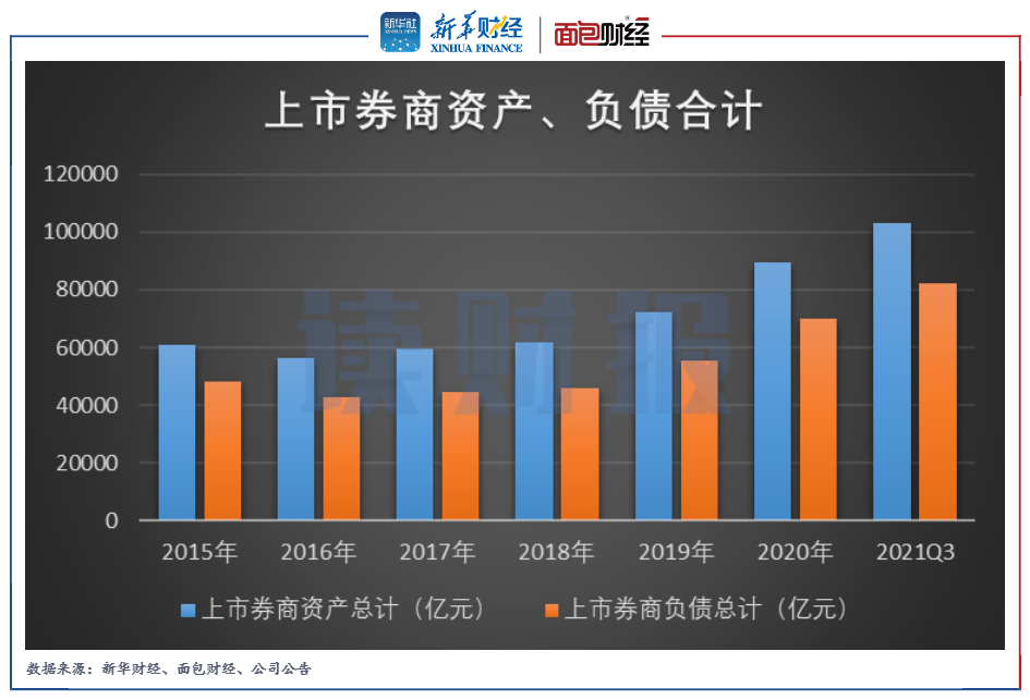 數據統計顯示,2016年至2021年三季度,合計40余家上市券商的總資產和總負債呈現出上升趨勢,整體而言,券商規模持續擴張。