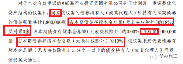 威海產業投資集團有限公司(原名為“威海市國有資本運營有限公司”,以下簡稱“威海產投”)的資產置換議案就未通過了。根據威海產投3月15日披露的《關于召開威海市國有資本運營有限公司公開發行2018年公司債券(第一期)2021年第一次債券持有人會議的公告》,擬通過置產置換實現優化資產結構的議案未通過。根據會議公告結果,同意票占存續本金總額的18%,棄權票占本金總額的10%,棄權票0張,議案未通過。本次參會持有人會議的比例合計為28%,這個比例也算是非常低了。