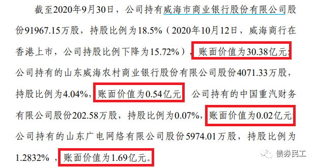 如果單純從賬面價值來說,擬劃入資產的價值大于擬劃出資產的價值。但是從股權的實際價值來看,銀行股權的實際價值應該更高,對于發行人信用加持的作用更大。尤其是威海銀行為香港上市公司(股票代碼9677.HK)。