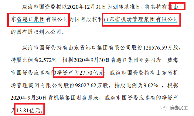 威海市國資委擬將其持有的山東省港口集團有限公司的國有股權(對應凈資產為27.70億元)和山東省機場管理集團有限公司的國有股權(對應凈資產為13.81億元)劃入公司,擬劃入股權對應凈資產為41.51億元。