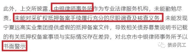 但是最讓債券民工關注的,是上海證券交易所對發行人律師北京市中銀律師事務所(為18 遠高01、19 遠高 01 和19 遠高02出具法律意見書 )予以書面警示,主要原因是“未能發現虛假的抵押備案文件”。