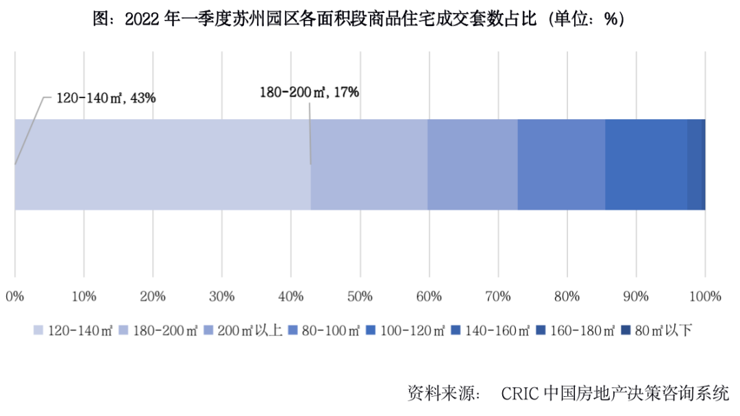 對核心區(qū)域,園區(qū)和獅山板塊,外地購房者置換周期的縮短將加劇區(qū)域內(nèi)熱銷項目認(rèn)籌難度。但當(dāng)前蘇州二套房首付80%的限貸政策尚未松動,因此改善市場不會出現(xiàn)較大波動。以園區(qū)為例,一季度120-140平方米首改面積段成交占比43%最高,其次是180-200平方米終改。因此新政后預(yù)計首改和終改產(chǎn)品競爭將更加劇烈。