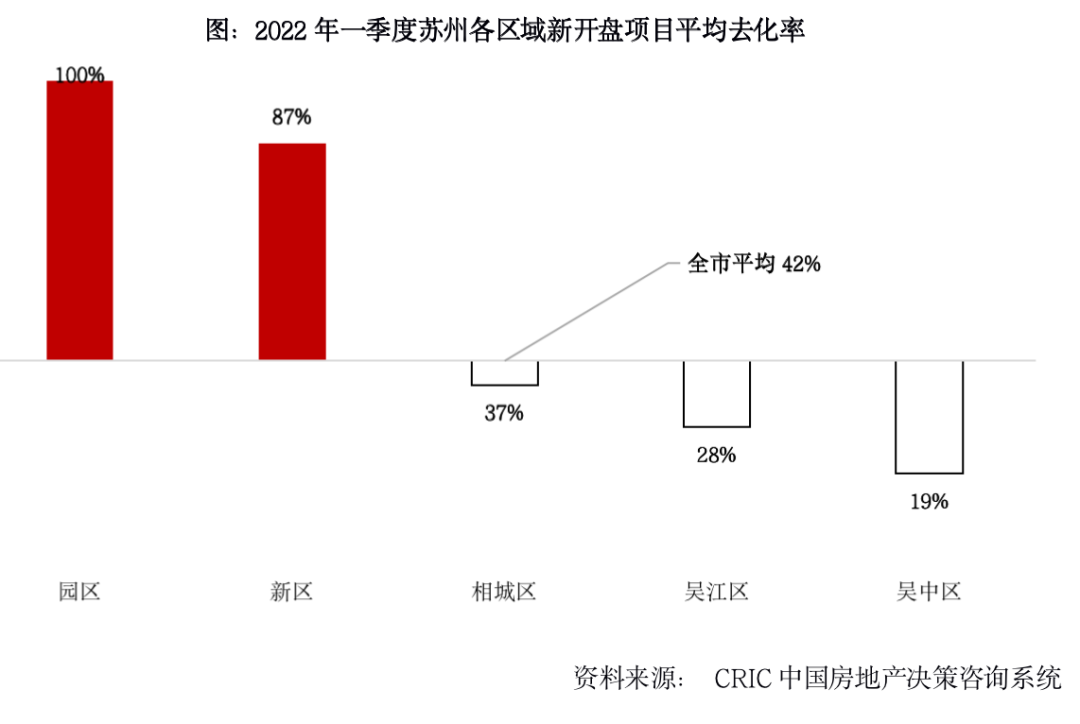蘇州,一季度樓市下行之中最大特點是區(qū)域間嚴(yán)重分化。一季度園區(qū)核心板塊去化最好,2個價格倒掛項目首開“日光”;新區(qū)去化率87%,在售項目去化率均60%以上。而絕大多數(shù)郊區(qū)板塊則成交慘淡,在售項目普遍做出降價8折以上優(yōu)惠,但去化率仍不足40%,其中吳中區(qū)僅19%。