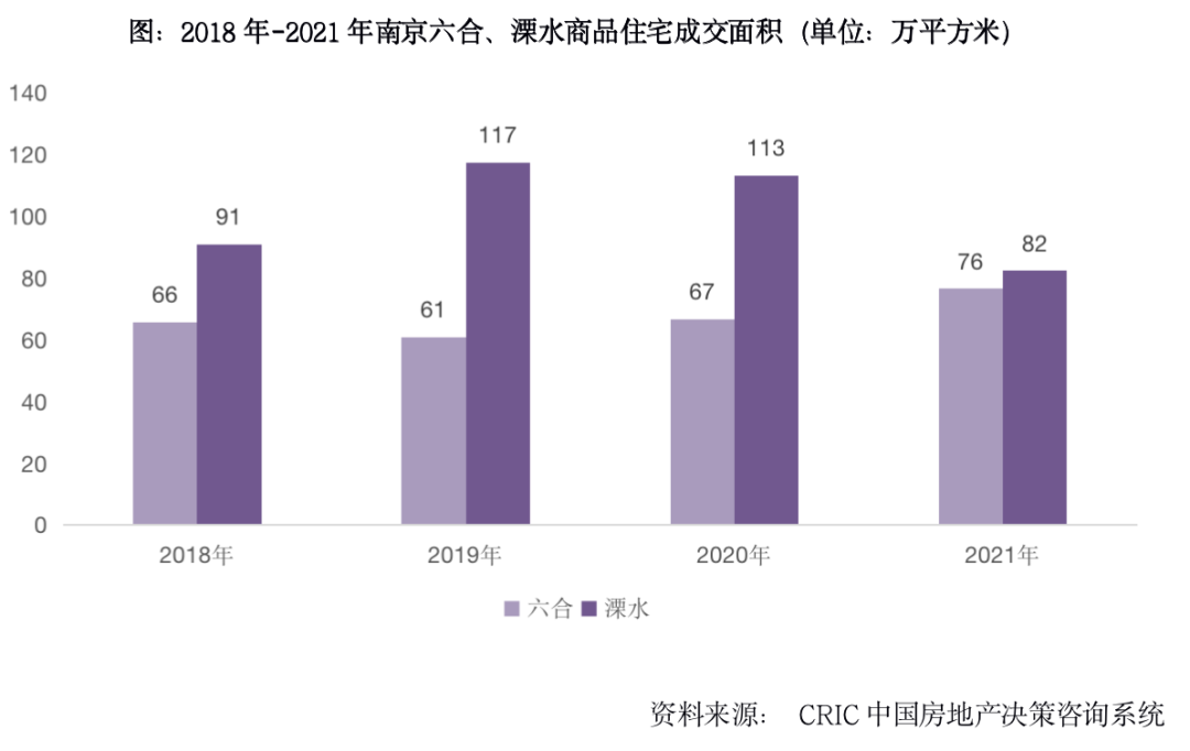 南京,相比蘇州而言本次政策更多的是試水和信號意義。2019年六合已放開大專以上學(xué)歷落戶,2021年六合和溧水落戶政策也均有放開,在實際購房操作上已不需要社保要求。從數(shù)據(jù)上來看,溧水和六合商品住宅成交分別于2019年和2021年達(dá)到規(guī)模高點,需求已提前釋放。同時本次政策并不包含購買力更好、市場較佳的江北新區(qū)覆蓋區(qū)域。因此本次放寬外地戶籍在兩區(qū)購房對后續(xù)新房成交提振余量有限。