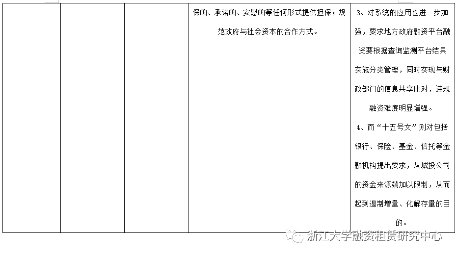“十五號(hào)文”從職責(zé)劃分、風(fēng)險(xiǎn)管理、系統(tǒng)管控、資金來(lái)源等多個(gè)方面對(duì)銀行保險(xiǎn)等金融機(jī)構(gòu)提出要求,地方政府融資平臺(tái)違規(guī)融資難度進(jìn)一步加大。