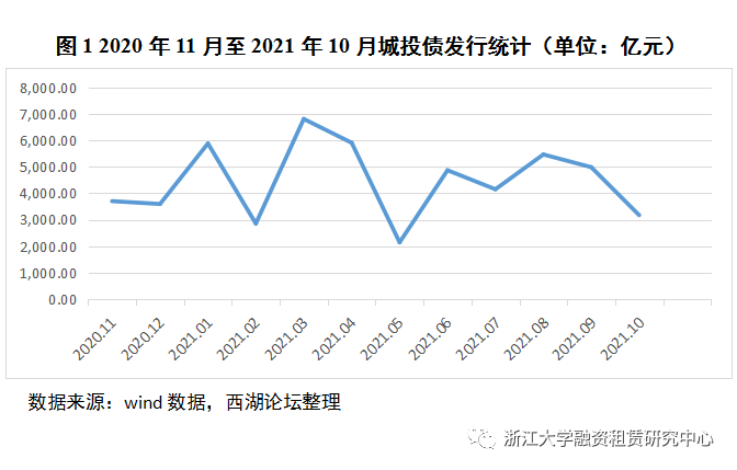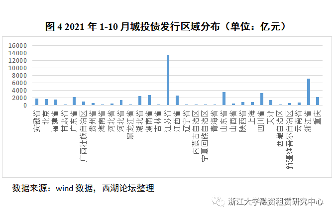 截至2021年10月,城投債發(fā)行規(guī)模波動(dòng)較大,3月發(fā)行量最高,達(dá)到6814.49億,5月發(fā)行量最低,2142.42億。值得注意的是,2021年7月“十五號(hào)文”發(fā)布后,城投債發(fā)行量從8月開(kāi)始逐步下降,說(shuō)明政策的收緊或許對(duì)城投債發(fā)行產(chǎn)生實(shí)質(zhì)性影響。