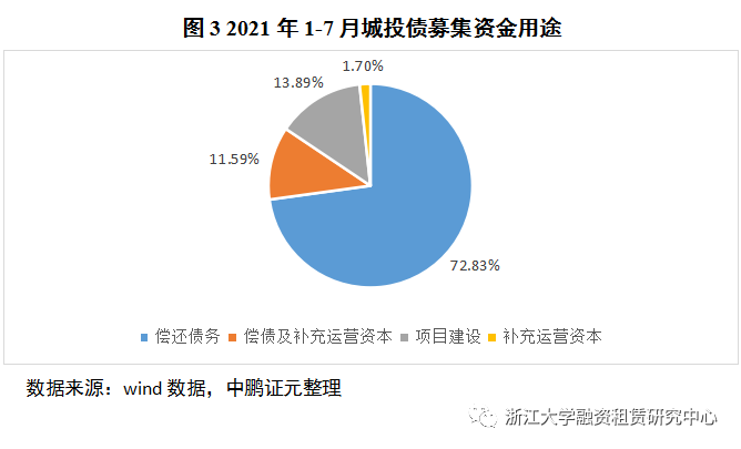 據(jù)中證鵬元資信數(shù)據(jù)顯示,截至2021年7月,城投債資金用途中,借新還舊是城投公司募集資金的主要用途,占比高達(dá)72.83%,此數(shù)據(jù)相較歷年穩(wěn)步提升。2021年以來(lái),城投公司債發(fā)行與監(jiān)管政策收緊,對(duì)于經(jīng)濟(jì)欠發(fā)達(dá)、債務(wù)率較高的地區(qū),城投債發(fā)行用途嚴(yán)格受限,多以償債為主,進(jìn)一步體現(xiàn)了監(jiān)管對(duì)遏制增量、化解存量的決心。