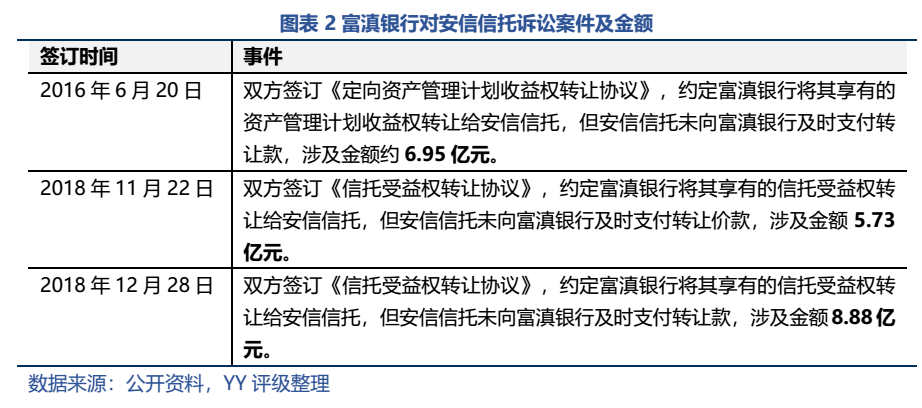 近些年安信信托一直負(fù)面輿情纏身,截至2020年末,安信信托已涉及幾十起訴訟,涉訴余額超過百億元,覆蓋銀行、地方金控和資管公司。富滇銀行的20多億能否被如數(shù)償還要被打上一個(gè)大大的問號(hào)。